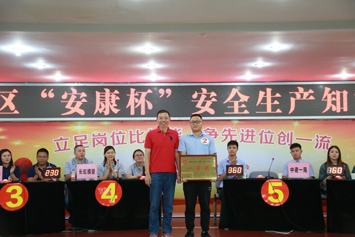 本次安全生产知识竞赛设置了“选择题”、“抢答题”、“问答题”“加赛题”等答题环节,竞赛内容涵盖了安全生产法律法规、安全管理知识、技术知识、操作规程、安全文化等方面内容。竞赛活动现场中的选手们个个精神饱满、回答问题流利娴熟,尤其在抢答题环节,各选手的精彩表现更是让竞赛现场高潮迭起,不时博得现场观众的阵阵掌声,各参赛队伍后援方队也纷纷欢呼呐喊,为台上的参赛选手加油鼓劲。经过几轮激烈角逐,最终,中建一局代表队在众参赛队伍中突出重围,斩获本次安全生产知识竞赛一等奖。