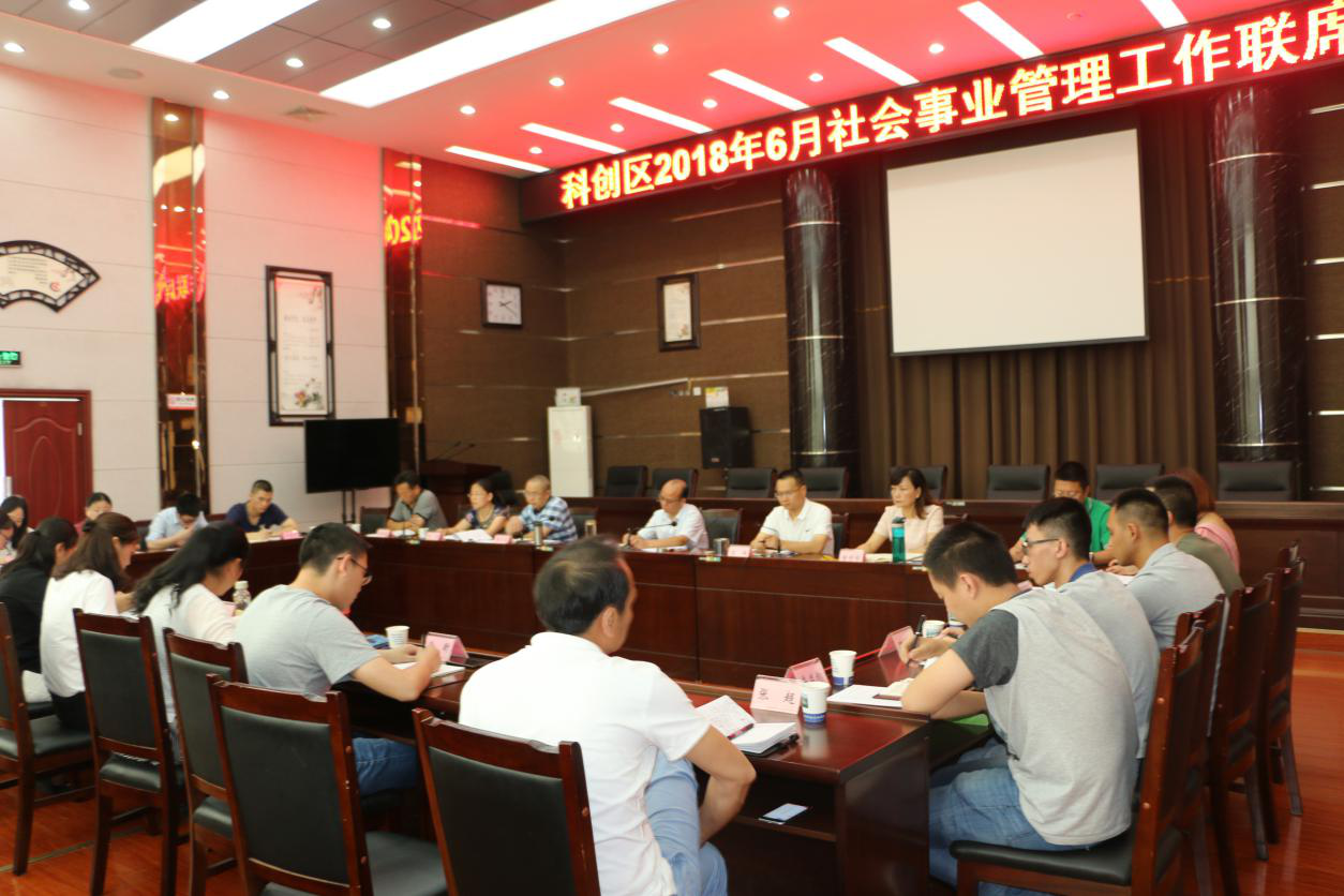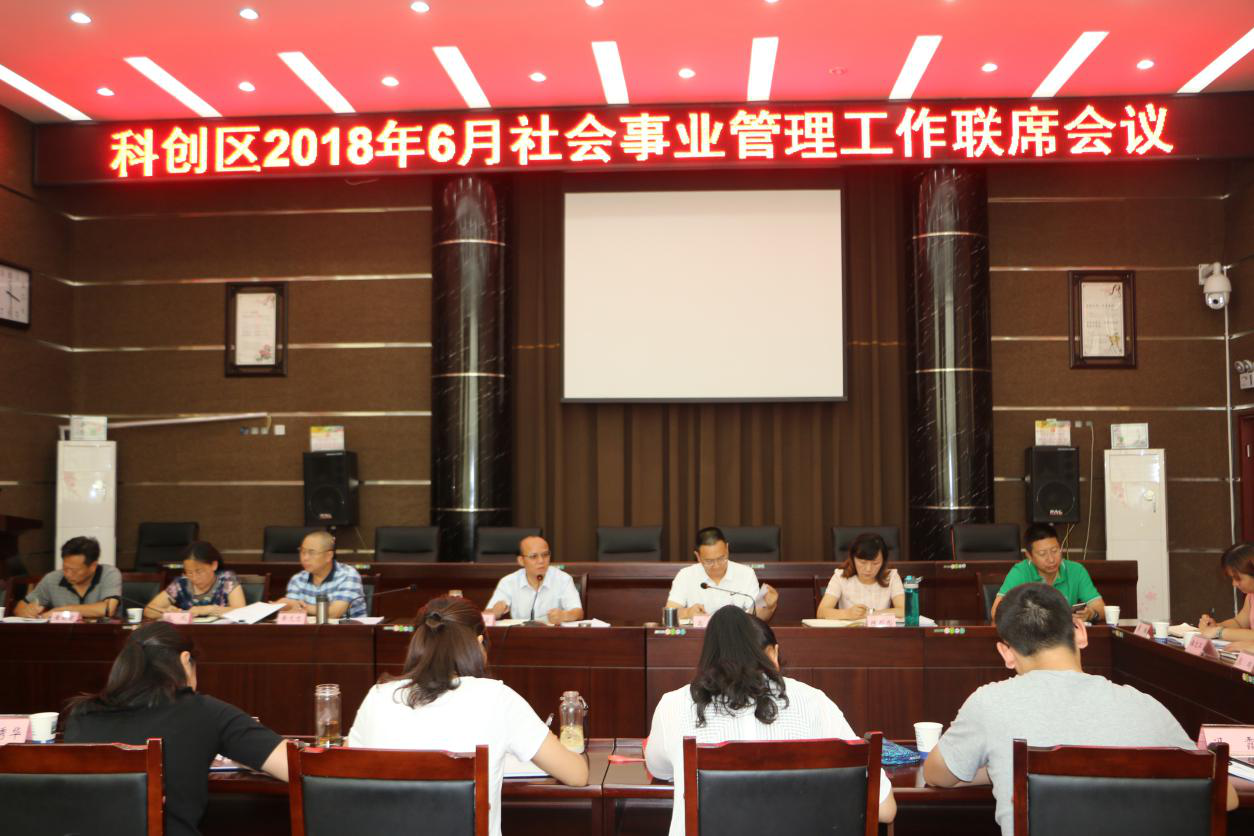 6月14日下午,科创区召开2018年6月社会事业管理工作联席会,会议由区社发局局长高健主持,区党工委委员杨启卫出席会议并作重要讲话。区社发局全体干部职工,街道办分管领导、社发办负责人,博雅学校、西山社区卫生服务中心负责人近30人参加了此次会议。